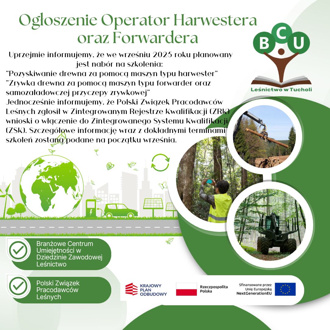 BCU Tuchola planuje uruchomienie we wrześniu 2025 szkoleń z: pozyskiwania drewna maszynami harwester, zrywki drewna maszynami forwarder i przyczepą samozaładowczą.
